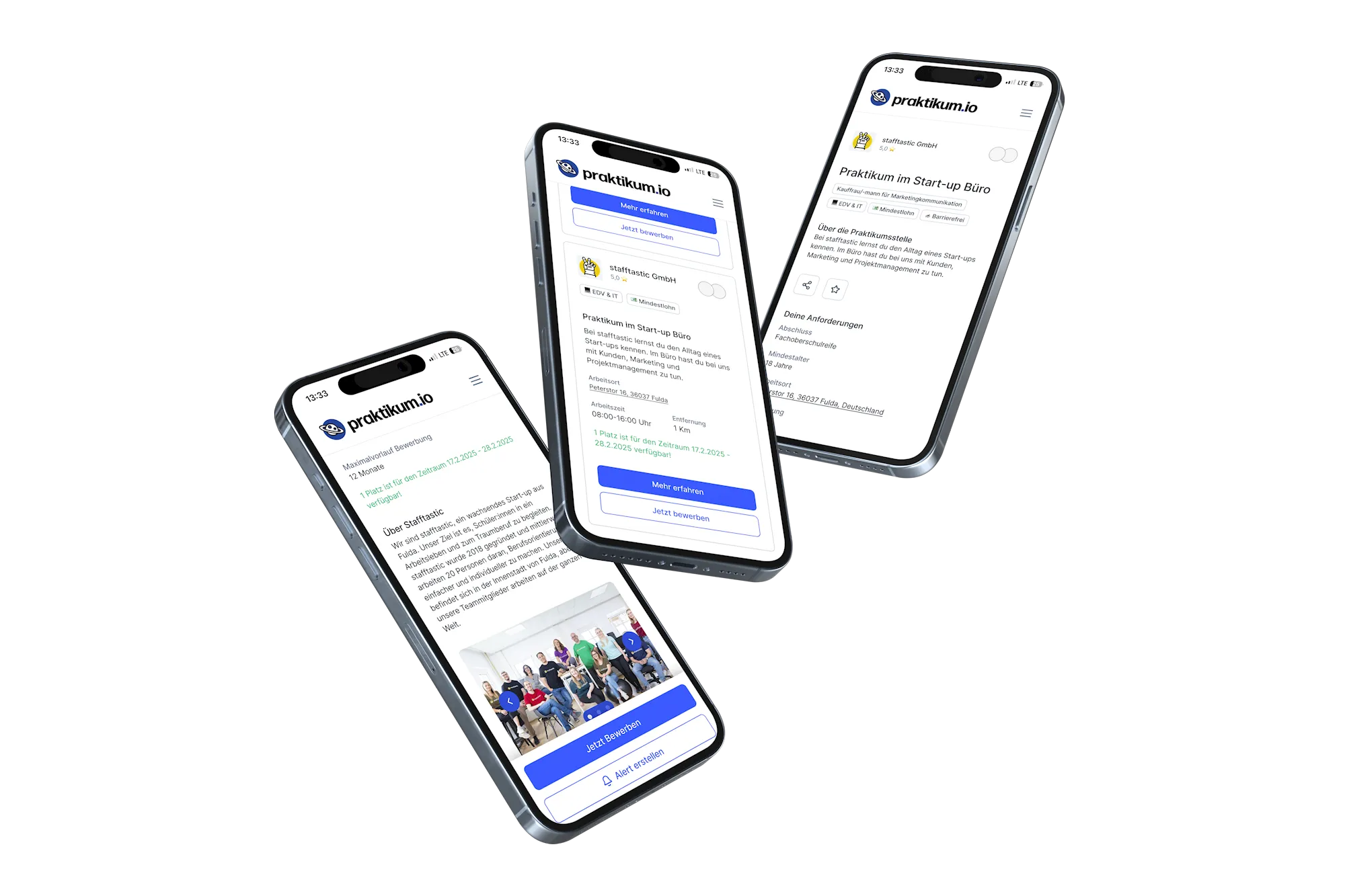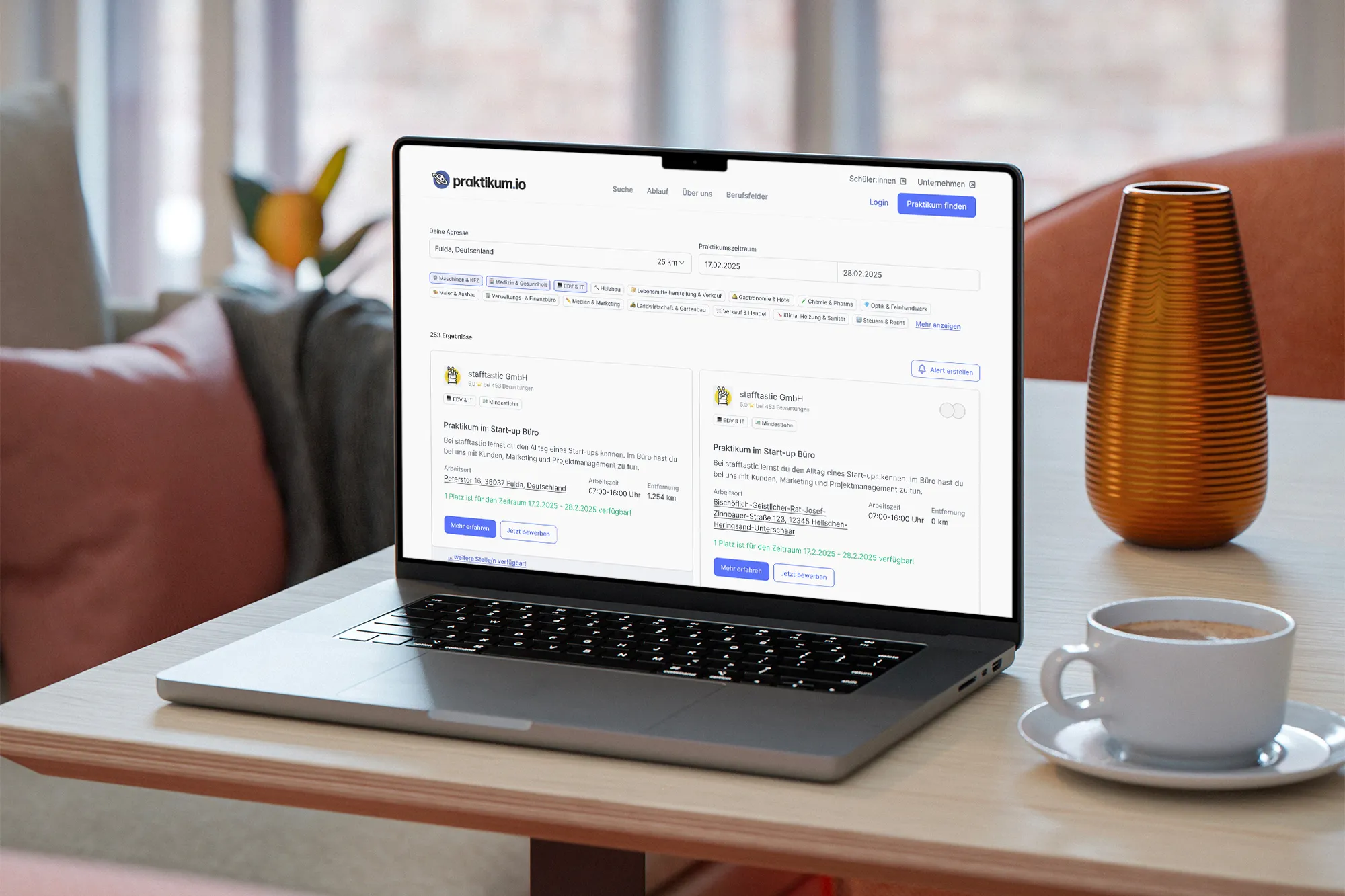 Für die innovative Plattform Praktikum.io von Stafftastic haben wir ein nutzerzentriertes UX/UI-Design entwickelt, das auf den Bedürfnissen von Schülern basiert, die ein Schülerpraktikum suchen. Die Plattform richtet sich auch an Unternehmen, die sich registrieren und Praktikumsstellen ausschreiben können. Die sorgfältige Analyse der Nutzerbedürfnisse und Herausforderungen bildete das Fundament unserer Gestaltungsentscheidungen. Von der initialen Konzeption bis zur systematischen Weiterentwicklung gestalten wir die digitale Zukunft der Praktikumsvermittlung – mit konkreten Lösungen, durchgehend bedarfsorientierter Ausrichtung und in enger Zusammenarbeit mit dem Stafftastic-Team.
